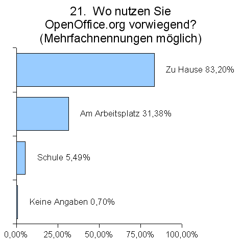 Der typische OpenOffice.org Anwender benutzt seinen Computer zu Hause oder am Arbeitsplatz. Relativ gering ist der Anteil der schulischen Nutzung. In der internationalen Umfrage ist die Nutzung am Arbeitsplatz um ca. 10% geringer. Das zeigt, dass neue Anwender eher im Heimbereich gewonnen wurden.