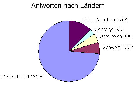 Mit total 18328 Antworten (ca. 25% aller Antworten) bilden deutschsprachige Nutzer einen beachtlichen Anteil an der Gesamtnutzerzahl. Innerhalb des deutschen Sprachraumes ist OpenOffice.org wiederum in Deutschland am weitesten verbreitet. Dies ist sicher durch die deutschen Wurzeln des Projektes begründet. Gleichzeitig zeigt es aber auch, dass in anderen Ländern mehr Öffentlichkeitsarbeit notwendig ist.